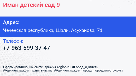 Иман, детский сад №9 по адресу Чеченская республика, Шали, Асуханова, 71 в дальнейшем Организация, размещена в следующих категориях: