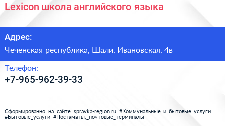 Lexicon, школа английского языка по адресу Чеченская республика, Шали, Ивановская, 4в в дальнейшем Организация, размещена в следующих категориях: