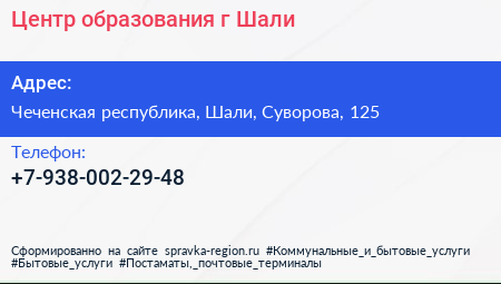 Центр образования г. Шали по адресу Чеченская республика, Шали, Суворова, 125 в дальнейшем Организация, размещена в следующих категориях: