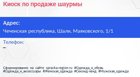 Киоск по продаже шаурмы по адресу Чеченская республика, Шали, Маяковского, 1/1 в дальнейшем Организация, размещена в следующих категориях: