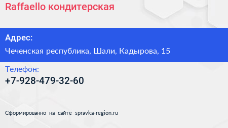 Raffaello, кондитерская по адресу Чеченская республика, Шали, Кадырова, 15 в дальнейшем Организация, размещена в следующих категориях: