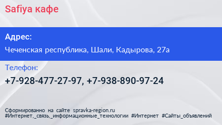 Safiya, кафе по адресу Чеченская республика, Шали, Кадырова, 27а в дальнейшем Организация, размещена в следующих категориях: