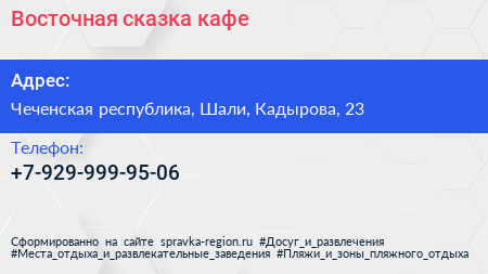 Восточная сказка, кафе по адресу Чеченская республика, Шали, Кадырова, 23 в дальнейшем Организация, размещена в следующих категориях: