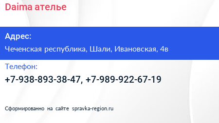 Daima, ателье по адресу Чеченская республика, Шали, Ивановская, 4в в дальнейшем Организация, размещена в следующих категориях:
