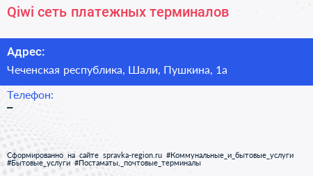 Qiwi, сеть платежных терминалов по адресу Чеченская республика, Шали, Пушкина, 1а в дальнейшем Организация, размещена в следующих категориях: