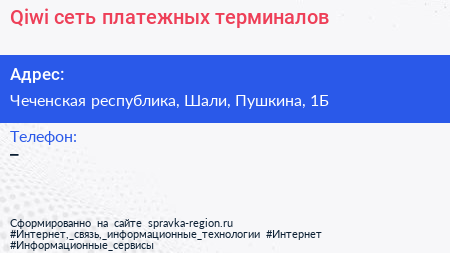 Qiwi, сеть платежных терминалов по адресу Чеченская республика, Шали, Пушкина, 1Б в дальнейшем Организация, размещена в следующих категориях: