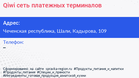 Qiwi, сеть платежных терминалов по адресу Чеченская республика, Шали, Кадырова, 109 в дальнейшем Организация, размещена в следующих категориях: