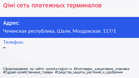 Qiwi, сеть платежных терминалов по адресу Чеченская республика, Шали, Моздокская, 117/1 в дальнейшем Организация, размещена в следующих категориях:
