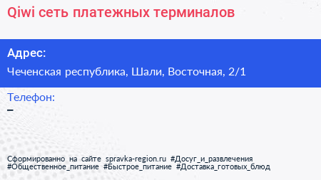 Qiwi, сеть платежных терминалов по адресу Чеченская республика, Шали, Восточная, 2/1 в дальнейшем Организация, размещена в следующих категориях: