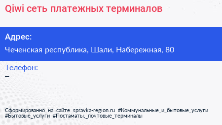 Qiwi, сеть платежных терминалов по адресу Чеченская республика, Шали, Набережная, 80 в дальнейшем Организация, размещена в следующих категориях: