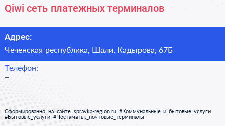 Qiwi, сеть платежных терминалов по адресу Чеченская республика, Шали, Кадырова, 67Б в дальнейшем Организация, размещена в следующих категориях: