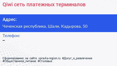 Qiwi, сеть платежных терминалов по адресу Чеченская республика, Шали, Кадырова, 50 в дальнейшем Организация, размещена в следующих категориях: