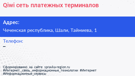 Qiwi, сеть платежных терминалов по адресу Чеченская республика, Шали, Таймиева, 1 в дальнейшем Организация, размещена в следующих категориях:
