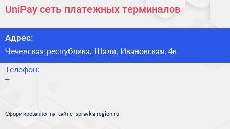 UniPay, сеть платежных терминалов по адресу Чеченская республика, Шали, Ивановская, 4в в дальнейшем Организация, размещена в следующих категориях: