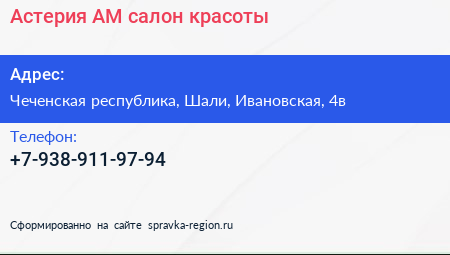 Астерия АМ, салон красоты по адресу Чеченская республика, Шали, Ивановская, 4в в дальнейшем Организация, размещена в следующих категориях: