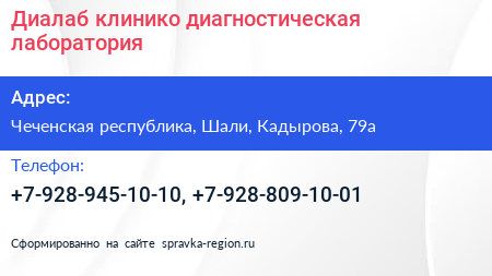 Диалаб, клинико-диагностическая лаборатория по адресу Чеченская республика, Шали, Кадырова, 79а в дальнейшем Организация, размещена в следующих категориях: