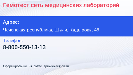 Гемотест, сеть медицинских лабораторий по адресу Чеченская республика, Шали, Кадырова, 49 в дальнейшем Организация, размещена в следующих категориях: