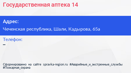 Государственная аптека №14 по адресу Чеченская республика, Шали, Кадырова, 65а в дальнейшем Организация, размещена в следующих категориях: