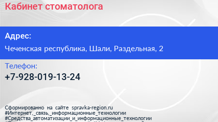 Кабинет стоматолога по адресу Чеченская республика, Шали, Раздельная, 2 в дальнейшем Организация, размещена в следующих категориях: