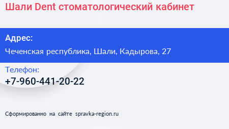 Шали Dent, стоматологический кабинет по адресу Чеченская республика, Шали, Кадырова, 27 в дальнейшем Организация, размещена в следующих категориях: