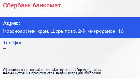 Сбербанк, банкомат по адресу Красноярский край, Шарыпово, 2-й микрорайон, 16 в дальнейшем Организация, размещена в следующих категориях: