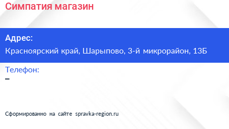 Симпатия, магазин по адресу Красноярский край, Шарыпово, 3-й микрорайон, 13Б в дальнейшем Организация, размещена в следующих категориях:
