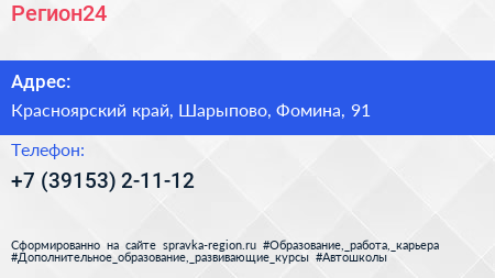 Регион24 по адресу Красноярский край, Шарыпово, Фомина, 91 в дальнейшем Организация, размещена в следующих категориях: