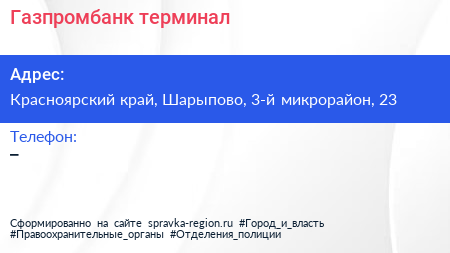 Газпромбанк, терминал по адресу Красноярский край, Шарыпово, 3-й микрорайон, 23 в дальнейшем Организация, размещена в следующих категориях: