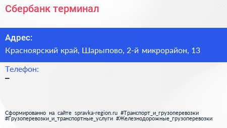 Сбербанк, терминал по адресу Красноярский край, Шарыпово, 2-й микрорайон, 13 в дальнейшем Организация, размещена в следующих категориях: