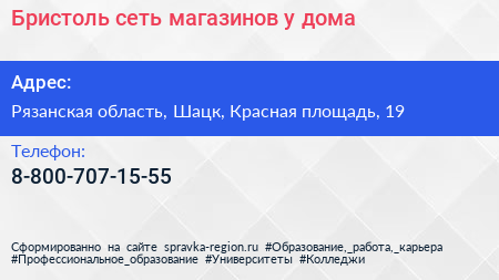 Бристоль, сеть магазинов у дома по адресу Рязанская область, Шацк, Красная площадь, 19 в дальнейшем Организация, размещена в следующих категориях: