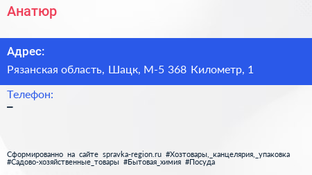 Анатюр по адресу Рязанская область, Шацк, М-5 368 Километр, 1 в дальнейшем Организация, размещена в следующих категориях: