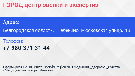 ГОРОД, центр оценки и экспертиз по адресу Белгородская область, Шебекино, Московская улица, 13 в дальнейшем Организация, размещена в следующих категориях: