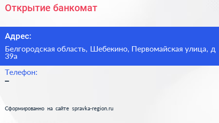 Открытие, банкомат по адресу Белгородская область, Шебекино, Первомайская улица, д 39а в дальнейшем Организация, размещена в следующих категориях: