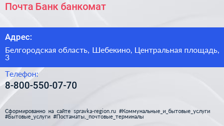 Почта Банк, банкомат по адресу Белгородская область, Шебекино, Центральная площадь, 3 в дальнейшем Организация, размещена в следующих категориях: