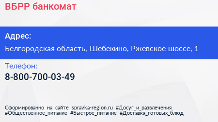 ВБРР, банкомат по адресу Белгородская область, Шебекино, Ржевское шоссе, 1 в дальнейшем Организация, размещена в следующих категориях: