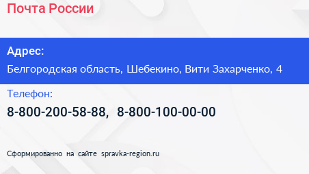 Почта России по адресу Белгородская область, Шебекино, Вити Захарченко, 4 в дальнейшем Организация, размещена в следующих категориях: