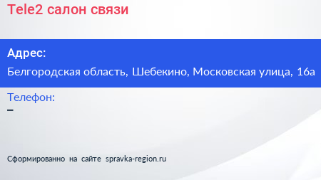 Tele2, салон связи по адресу Белгородская область, Шебекино, Московская улица, 16а в дальнейшем Организация, размещена в следующих категориях: