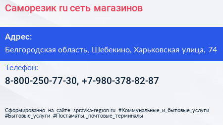 Саморезик.ru, сеть магазинов по адресу Белгородская область, Шебекино, Харьковская улица, 74 в дальнейшем Организация, размещена в следующих категориях: