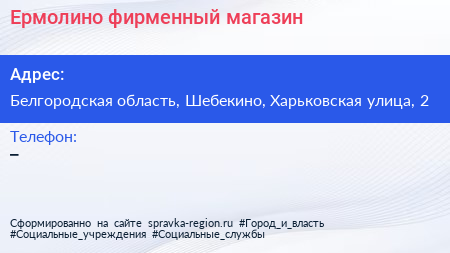 Ермолино, фирменный магазин по адресу Белгородская область, Шебекино, Харьковская улица, 2 в дальнейшем Организация, размещена в следующих категориях: