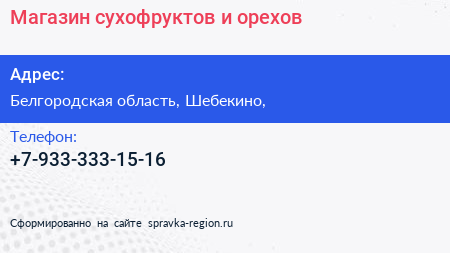 Магазин сухофруктов и орехов по адресу Белгородская область, Шебекино, в дальнейшем Организация, размещена в следующих категориях: