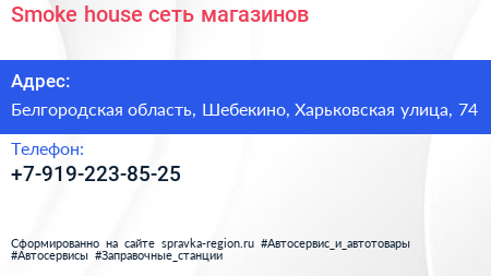 Smoke house, сеть магазинов по адресу Белгородская область, Шебекино, Харьковская улица, 74 в дальнейшем Организация, размещена в следующих категориях: