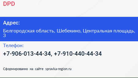 DPD по адресу Белгородская область, Шебекино, Центральная площадь, 3 в дальнейшем Организация, размещена в следующих категориях: