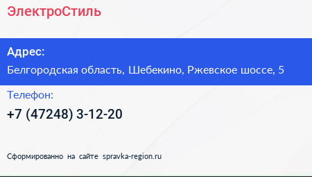 ЭлектроСтиль по адресу Белгородская область, Шебекино, Ржевское шоссе, 5 в дальнейшем Организация, размещена в следующих категориях: