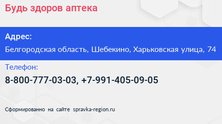 Будь здоров!, аптека по адресу Белгородская область, Шебекино, Харьковская улица, 74 в дальнейшем Организация, размещена в следующих категориях: