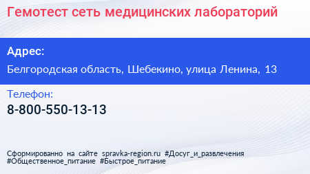 Гемотест, сеть медицинских лабораторий по адресу Белгородская область, Шебекино, улица Ленина, 13 в дальнейшем Организация, размещена в следующих категориях: