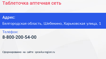 Таблеточка, аптечная сеть по адресу Белгородская область, Шебекино, Харьковская улица, 1 в дальнейшем Организация, размещена в следующих категориях: