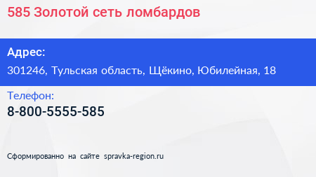 585*Золотой, сеть ломбардов по адресу 301246, Тульская область, Щёкино, Юбилейная, 18 в дальнейшем Организация, размещена в следующих категориях: