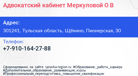 Адвокатский кабинет Меркуловой О.В. по адресу 301241, Тульская область, Щёкино, Пионерская, 30 в дальнейшем Организация, размещена в следующих категориях: