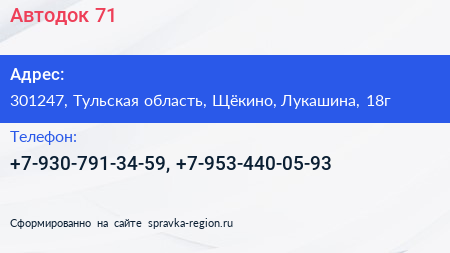 Автодок-71 по адресу 301247, Тульская область, Щёкино, Лукашина, 18г в дальнейшем Организация, размещена в следующих категориях: