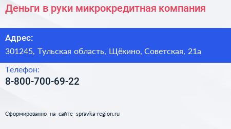 Деньги в руки, микрокредитная компания по адресу 301245, Тульская область, Щёкино, Советская, 21а в дальнейшем Организация, размещена в следующих категориях: